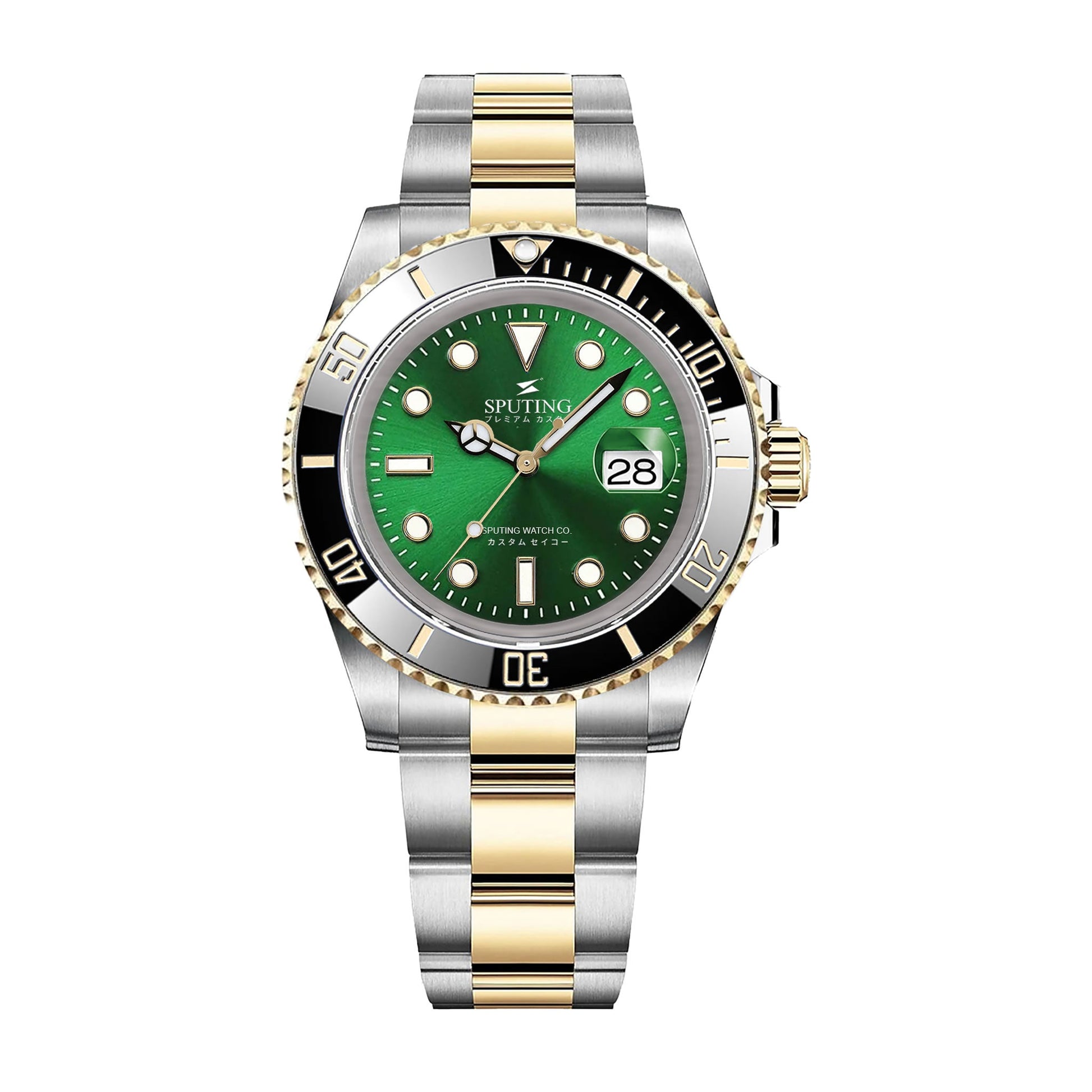 The Commemorative Submariner Two-tone Oyster Green Dial with Black and Gold Bezel Insert is crafted with premium custom Seiko custom parts for a superior watch experience. Authentic Seiko supplied decorated NH Series NH35 movement. Expand your horizons and explore the depths of designs with this high-quality timepiece.