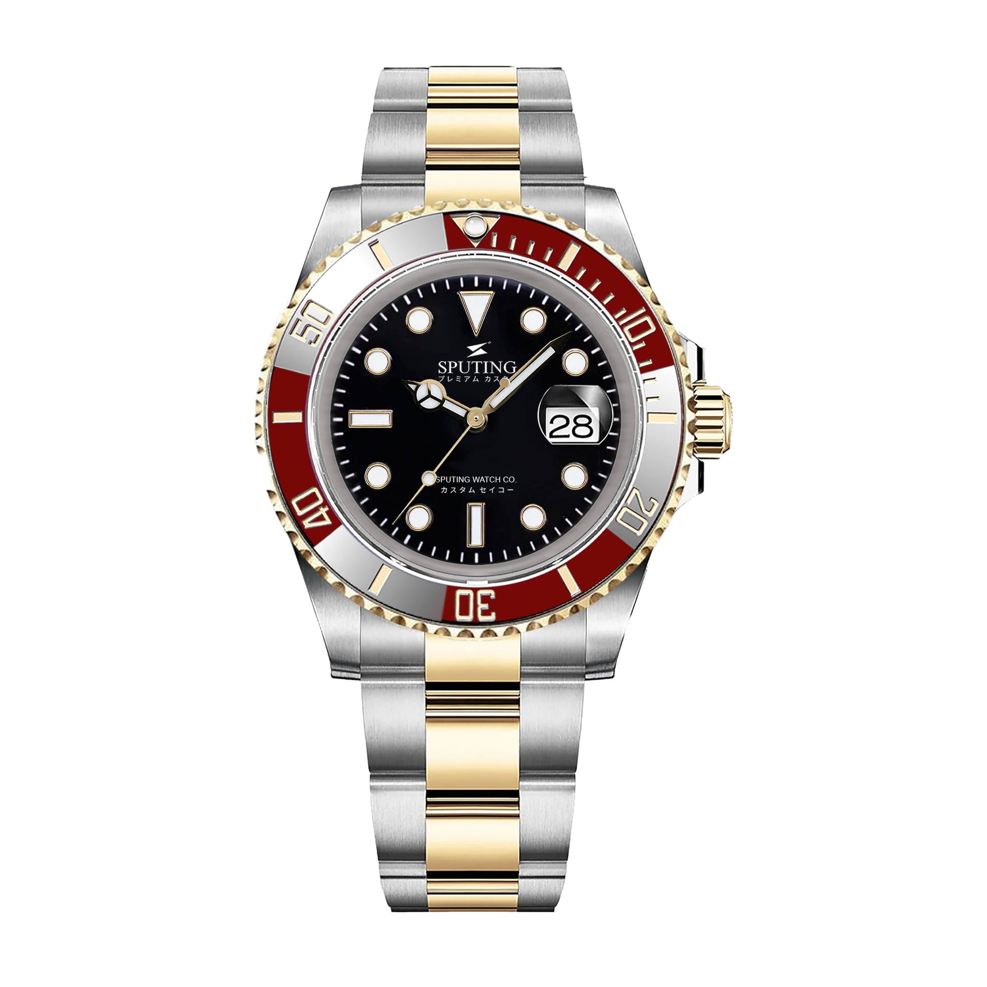 The Sputing Submariner Two-tone Oyster Black Dial with Red and White Bezel Insert is crafted with premium custom Seiko custom parts for a superior watch experience. Authentic Seiko supplied decorated NH Series NH35 movement. Expand your horizons and explore the depths of designs with this high-quality timepiece.
